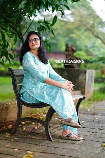 Crafted in breathable cotton, this soothing green kurti set showcases minimal geometric prints that add a modern touch. The relaxed-fit kurti, tapered pants, and airy dupatta make it ideal for office, travel, or casual outings.